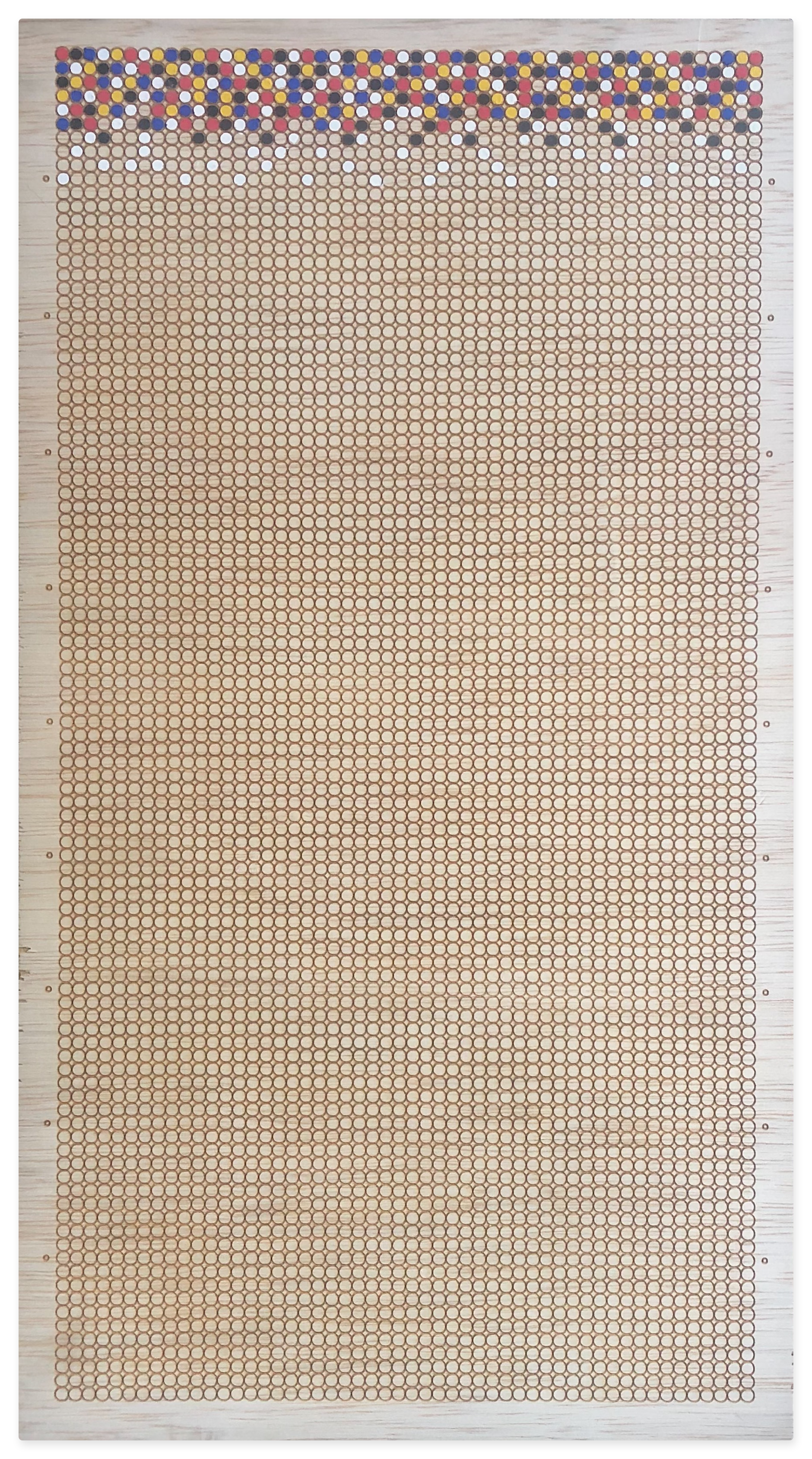 The initial version of the board was cut onto 1/8"-thick plywood and featured a 52 x 100 grid of circles for the weeks. After the 4020th bubble, I added a small "+" symbol to indicate weeks beyond the average life expectancy of an American adult (77.3 years). I also etched numbers for each decade directly into the board.