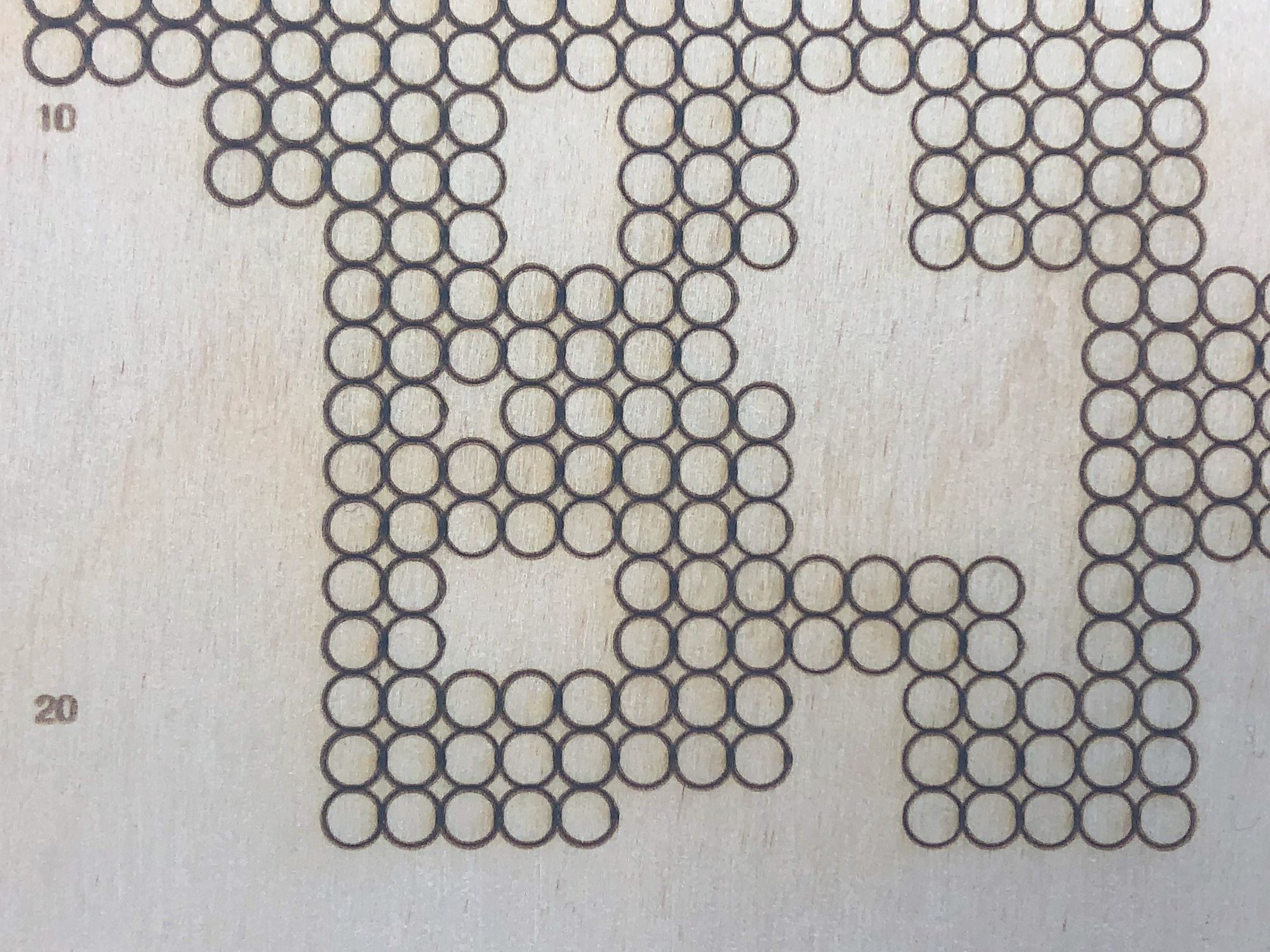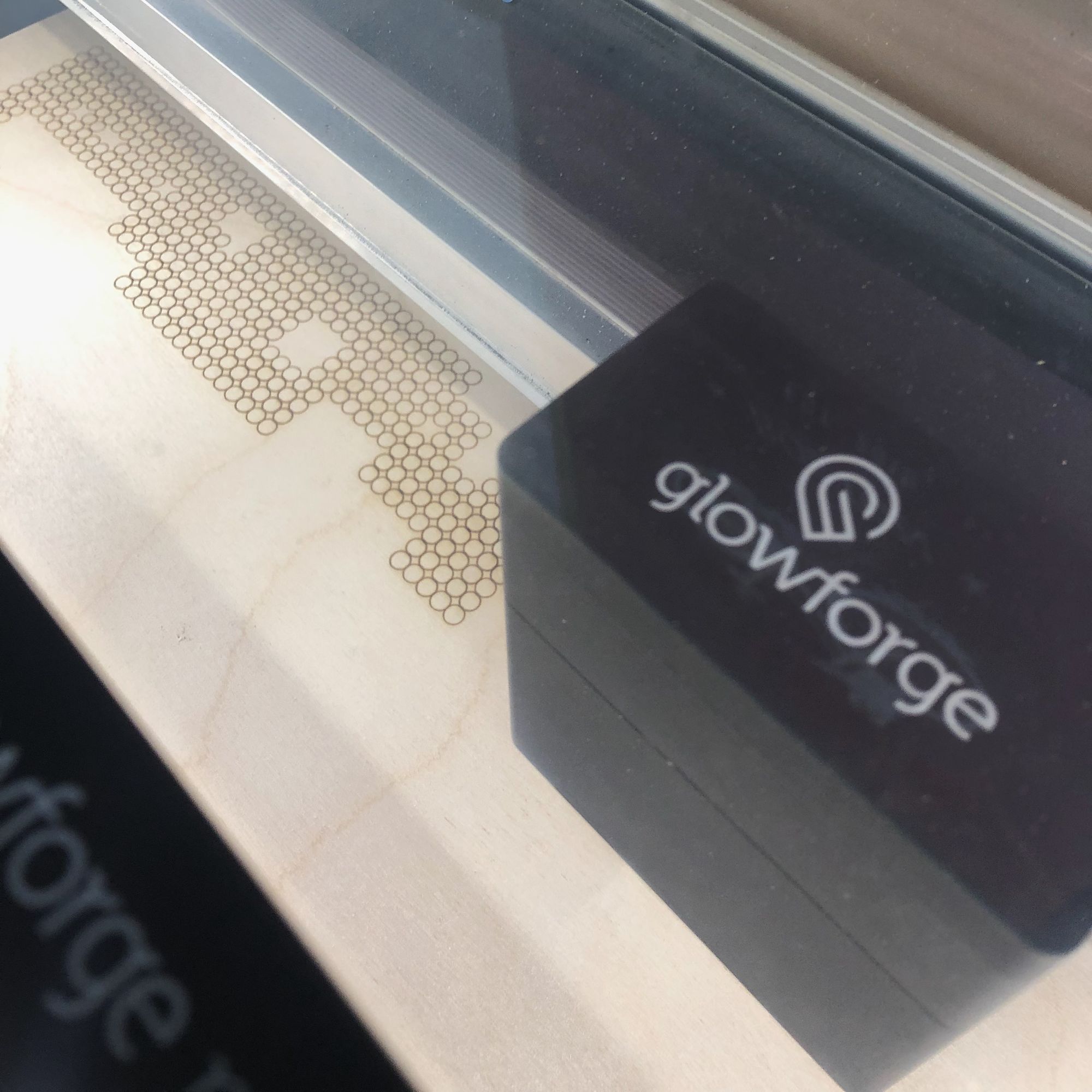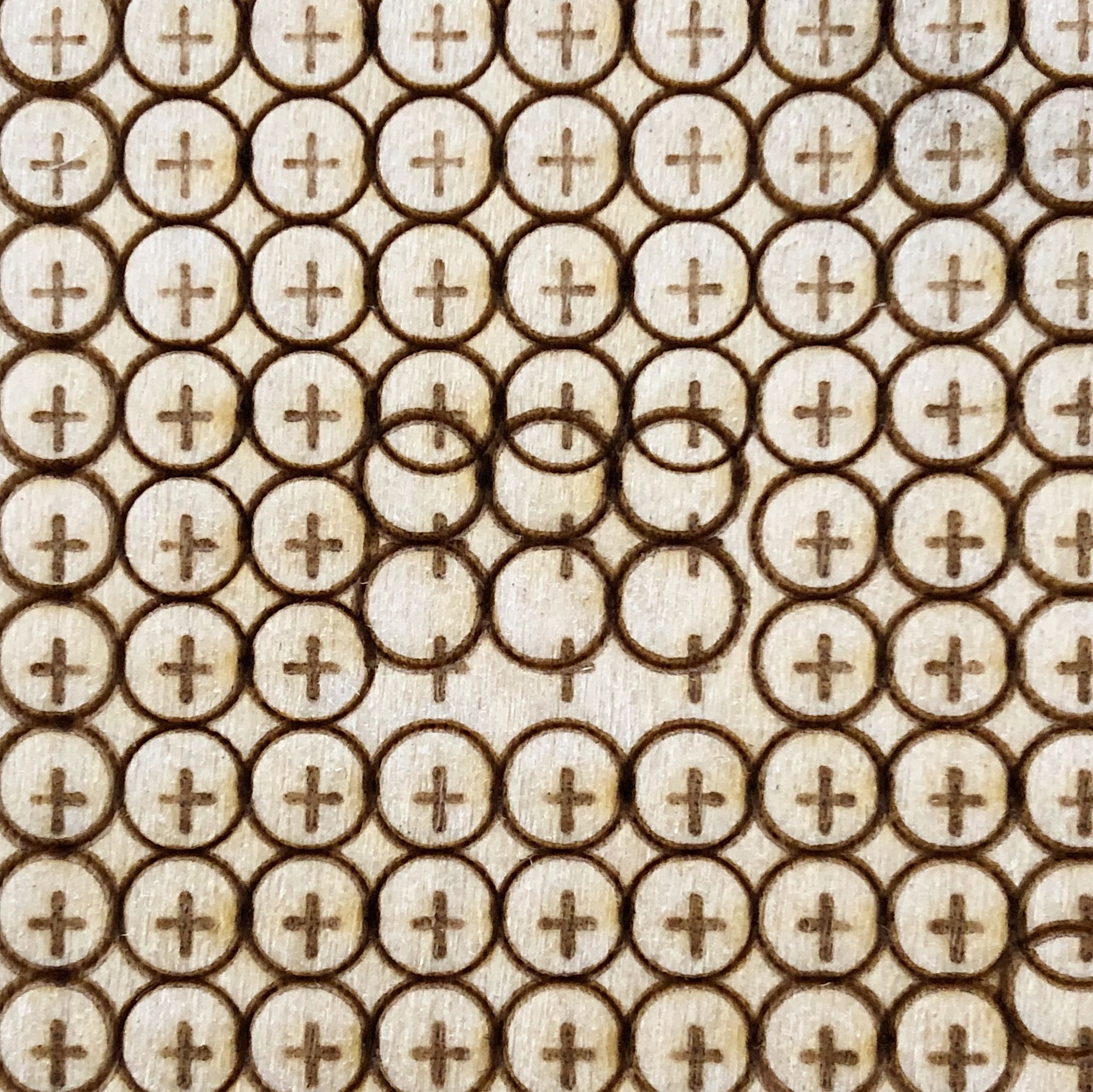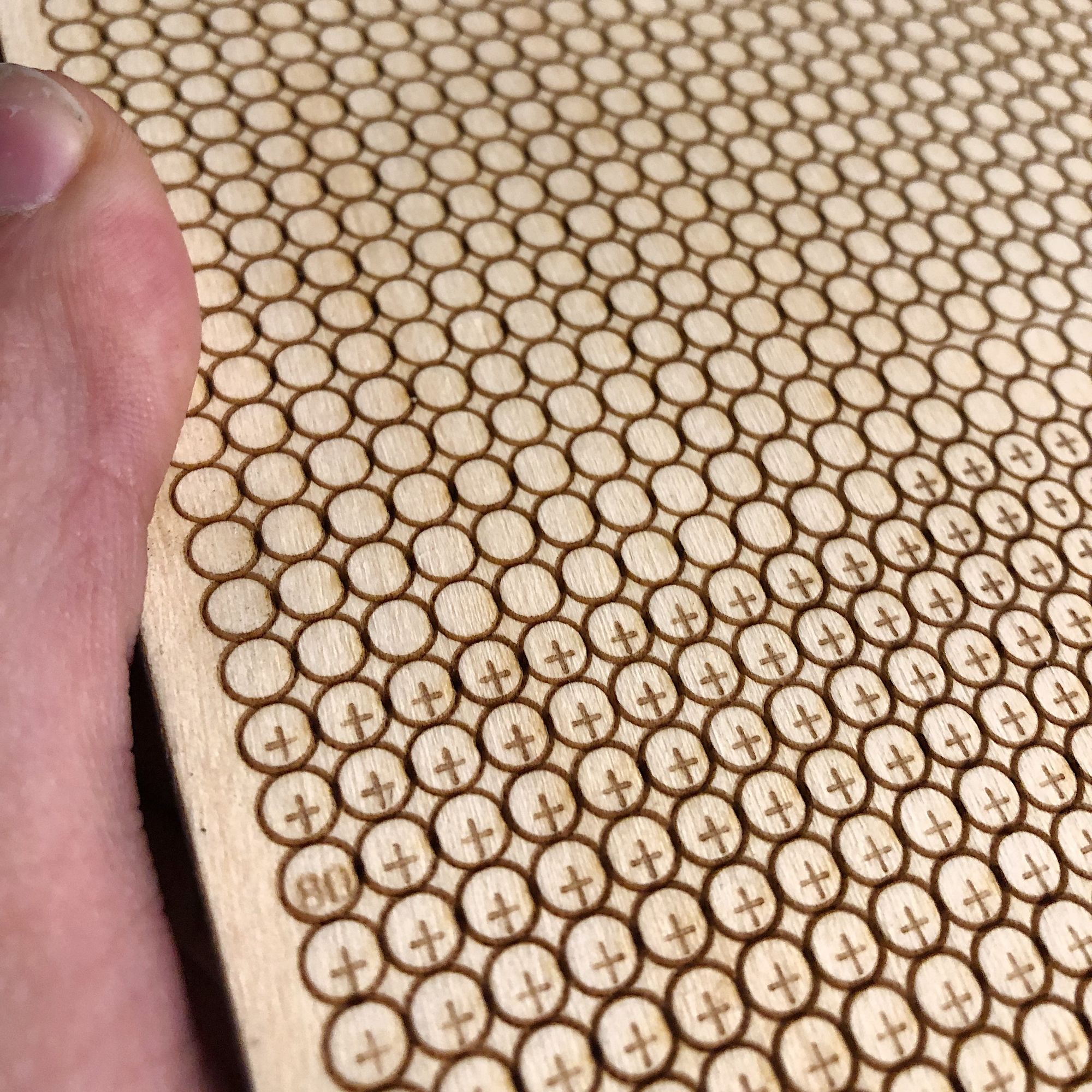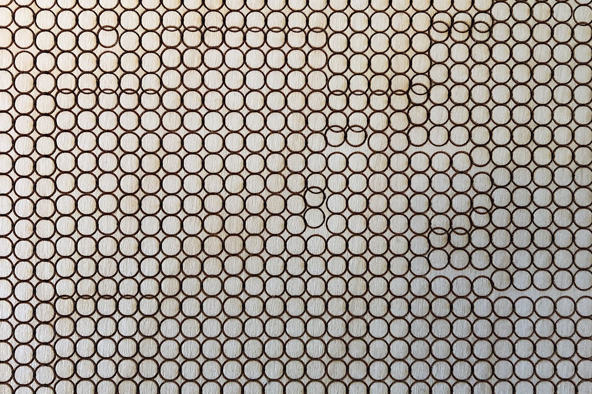 Despite my experience, I struggled from the outset. For some reason, the cutters I was using - the Glowforge Pro and the 60W ULS system - couldn't reproduce the perfectly aligned matrix of bubbles I created using Adobe Illustrator. The machines would snake around in a winding pattern, etching bubbles into the wood surface until the last minutes of the print job, when it would shift the remaining bubbles off by 1/4".