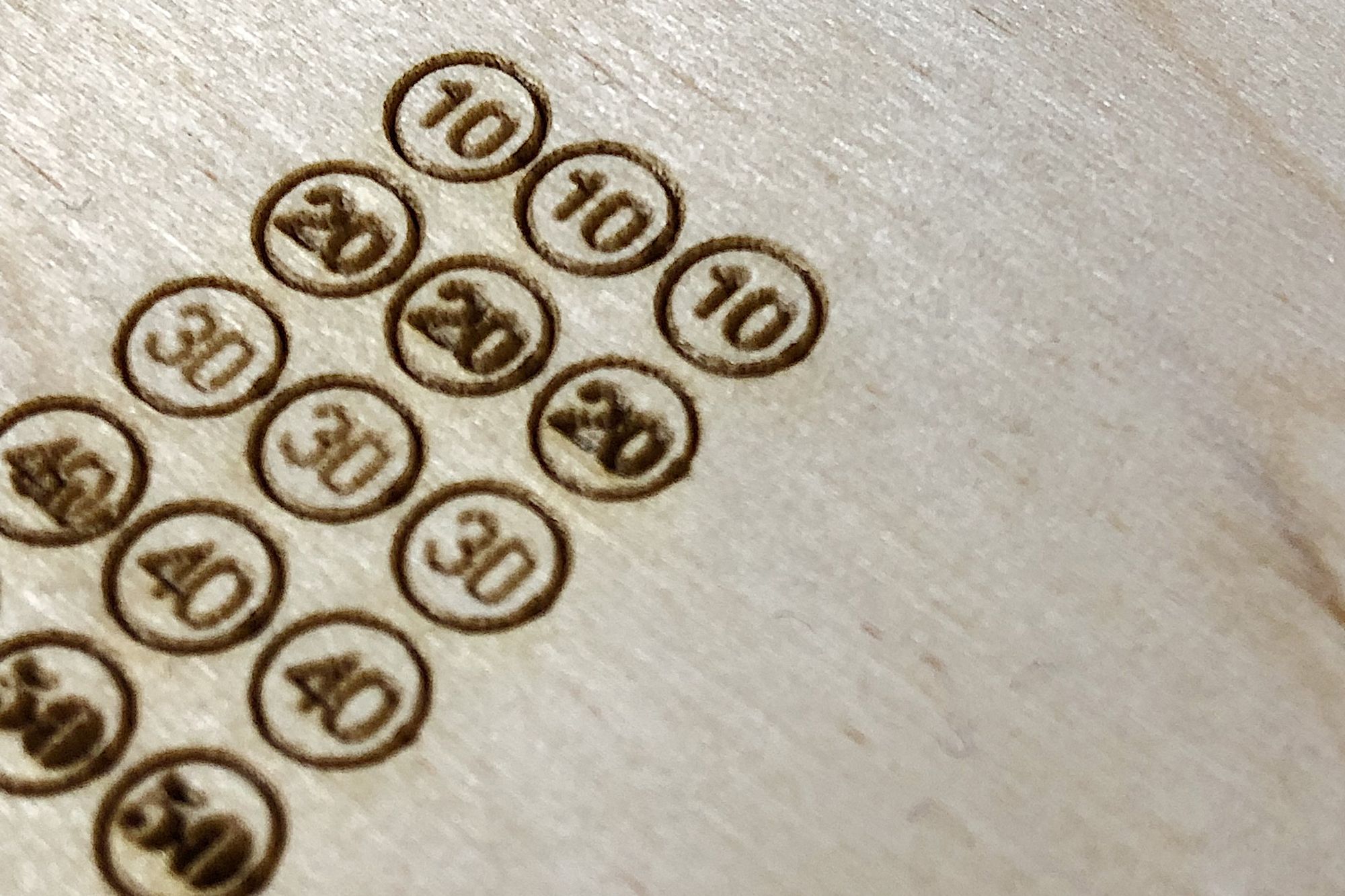 My initial concept was to use paint to fill the weekly grid, which I would carve onto a piece of wood using a laser cutter. A laser cutter might sound a little intimidating, but they work just like inkjet printers: send the machine a file, and it lays down a 2D image, except with a high-powered laser instead of ink droplets. The effect is a precise, two-toned image etched directly into whatever material you use. I already had a fair amount of experience with laser cutters, and I got started quickly by testing different speeds and powers for the laser.