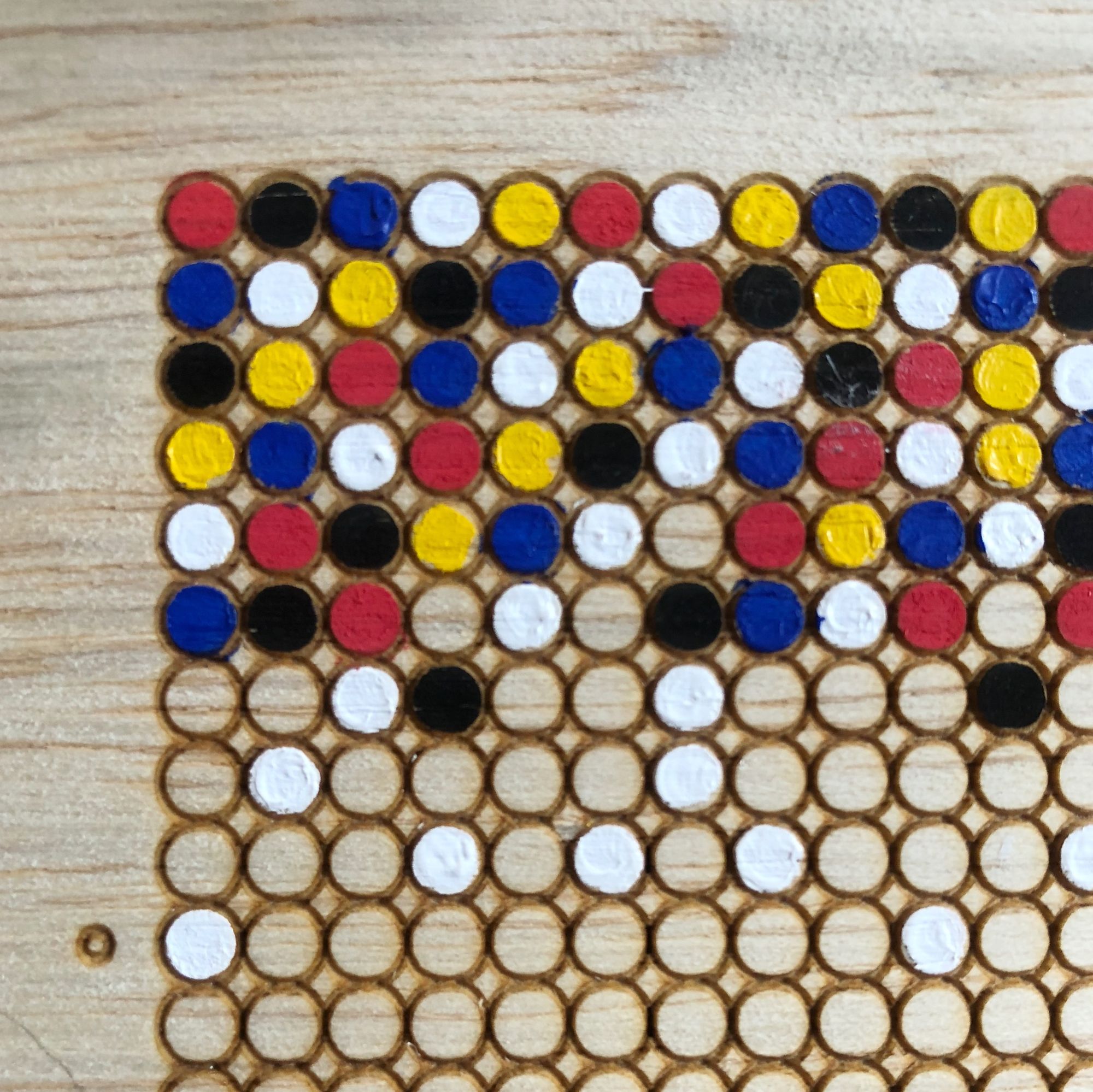 The first prototypes were promising, but I wanted something cleaner and more refined. My partner Al recommended I remove the plus symbols to simplify the board visually and remove the risk of moralizing longer lives. I also decided to switch to a thicker piece of plywood and replace the decade numbers with simple circular markers on the side of the grid. These changes got me closer to my intended design, and I gifted two versions of this prototype to my Mom and Al for the holidays. The images below are a version of the board I started filling in to get a sense of how it might look with a speckled pattern.
