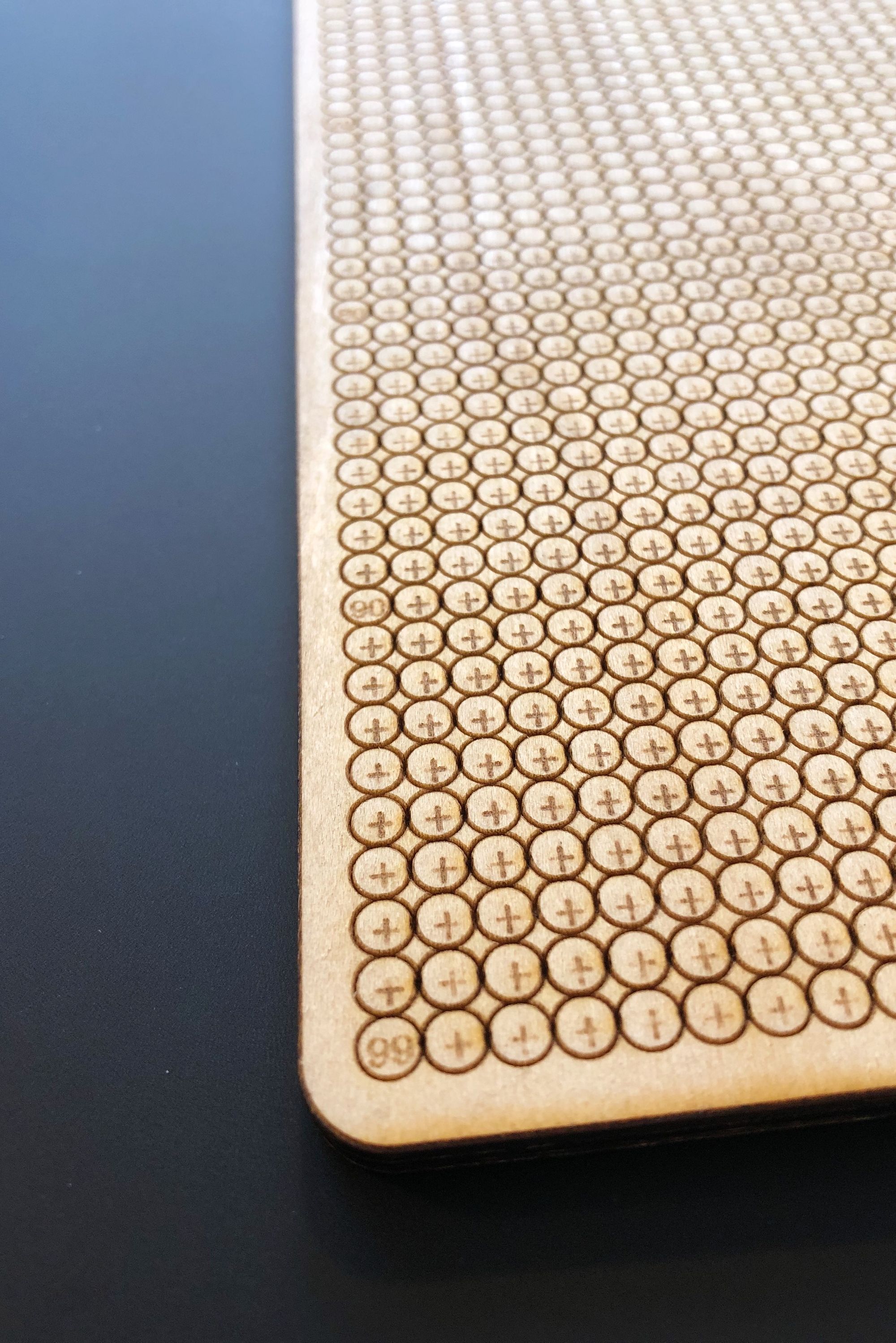 The initial version of the board was cut onto 1/8"-thick plywood and featured a 52 x 100 grid of circles for the weeks. After the 4020th bubble, I added a small "+" symbol to indicate weeks beyond the average life expectancy of an American adult (77.3 years). I also etched numbers for each decade directly into the board.